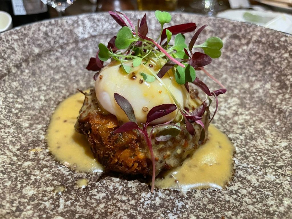 Smoked ham hock and potato cake served with poached egg and mustard sauce.