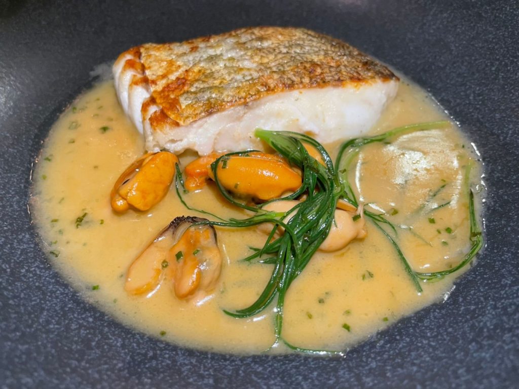 Cod with monks beard, mussel, lemon and chive sauce.